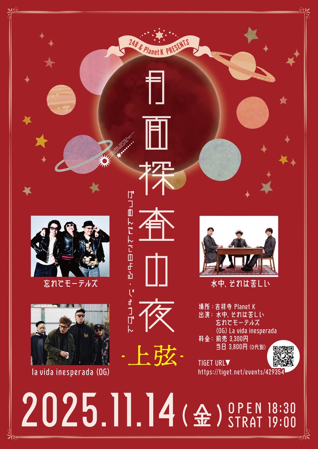 2025.12.14 « イベント一覧 このイベントは終了しました。 吉祥寺 Planet K 11月14日(金) « 吉祥寺大移動 池袋Adm » 月面探査の夜-上弦- open 18:30/ start 19:00 ¥3300/3800(D代別途) w/水中、それは苦しい / 忘れてモーテルズ /OG:La vida inesperada チケット TIGET 9/17 20:00〜 バンド取り置き予約 カレンダーに追加 Google カレンダー iCalendar Outlook 365 Outlook Live 詳細 日付: 11月14日(金)